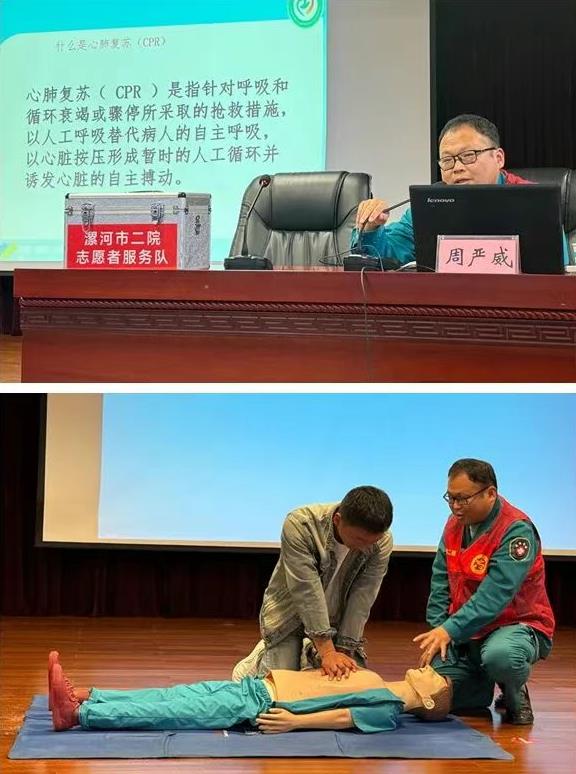 隨后,急診科副主任醫(yī)師周嚴威圍繞《應急急救技能實操》進行專題講解與現(xiàn)場演示,重點聚焦海姆立克急救法與心肺復蘇術(shù)兩大關(guān)鍵技能。為讓職工更直觀掌握動作要領(lǐng),周嚴威副主任醫(yī)師使用人體模型進行多輪演示,同時邀請現(xiàn)場職工上臺實操練習,確保每位參與實操的職工都能規(guī)范掌握核心步驟。