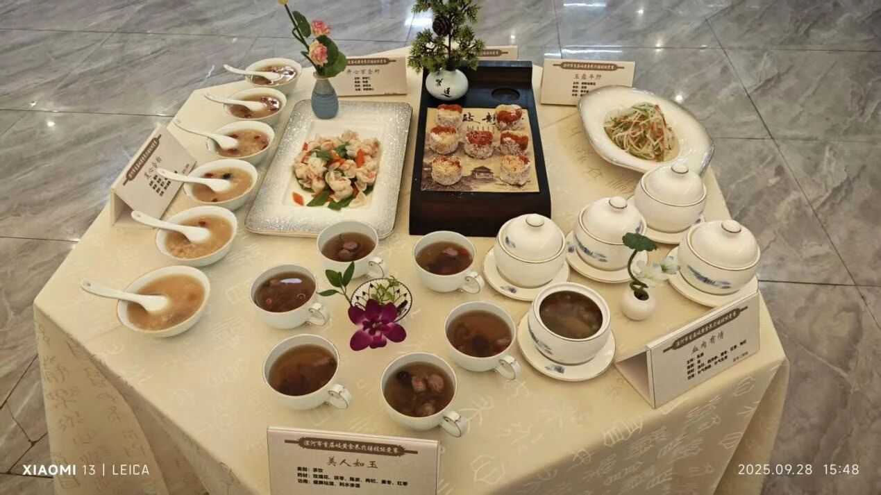 經(jīng)過激烈角逐,團隊憑借“開心百合蝦”“玉芝云糕”“玉露平肝”“血肉有情”“美人如玉”等一系列兼具養(yǎng)生功效與美味口感的藥膳作品(如圖中展示的精美藥膳,涵蓋熱菜、涼菜、面點、湯品、茶飲等多種類型),從眾多參賽隊伍中脫穎而出,成功斬獲團體二等獎,與漯河技師學院共享這一榮譽,充分彰顯了醫(yī)院在食養(yǎng)藥膳領域的綜合實力。