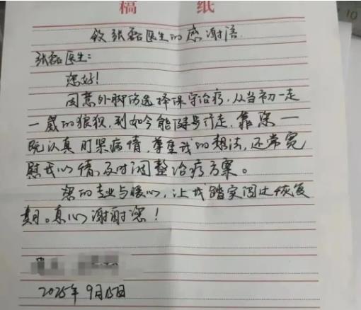 就這樣,在專業(yè)治療與耐心陪伴下,患者的腳踝一天天好轉(zhuǎn):從最初只能緩慢行走,到后來(lái)能正常上下樓梯,再到如今可以輕松散步——曾經(jīng)讓患者困擾不已的“老大難”問(wèn)題,終于徹底解決。出院那天,患者特意手寫了這封感謝信,字里行間滿是真誠(chéng):“張醫(yī)生不僅治好了我的疼痛,更撫平了我心里的焦慮,這樣的好醫(yī)生,值得我們真心感謝!”
